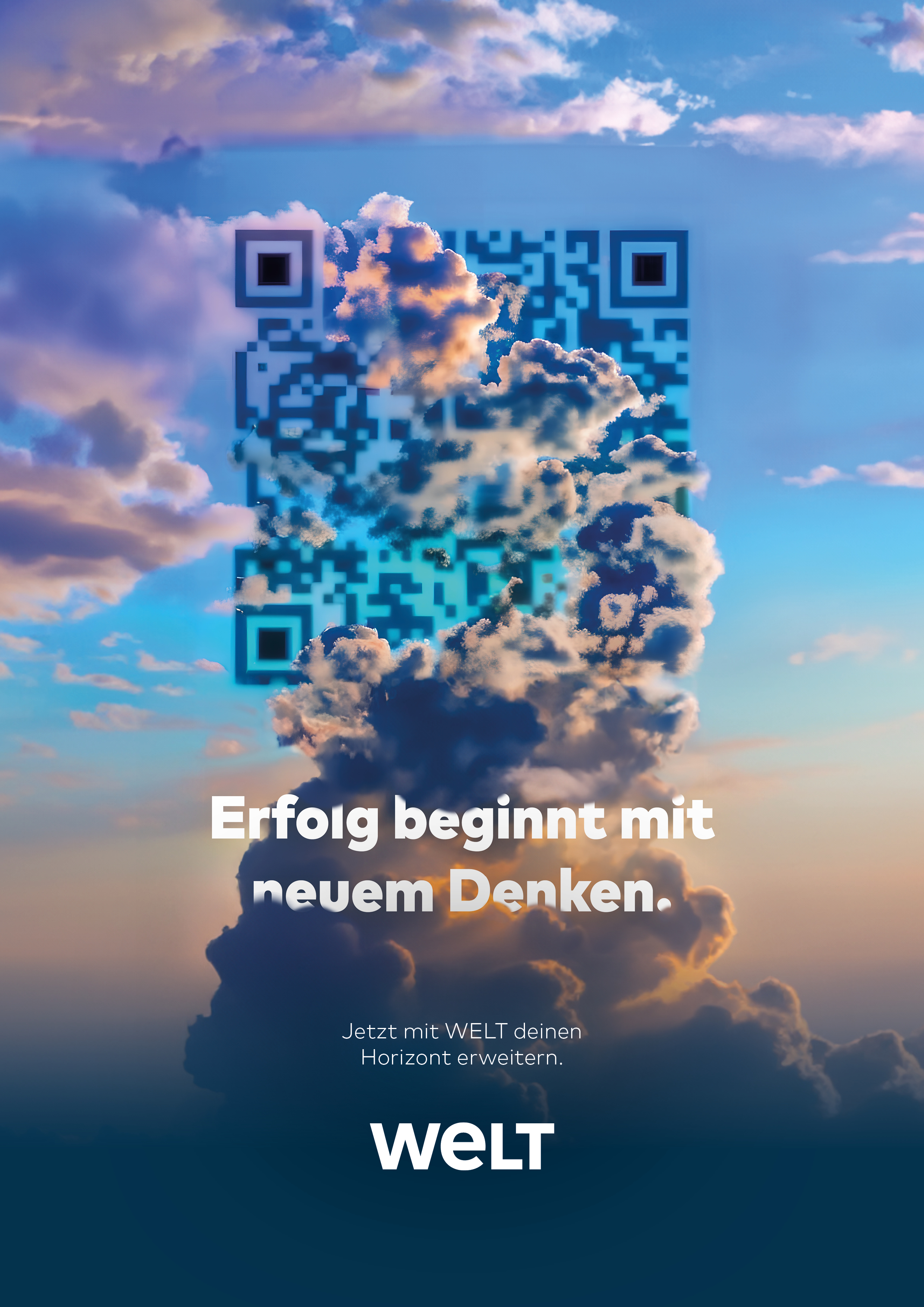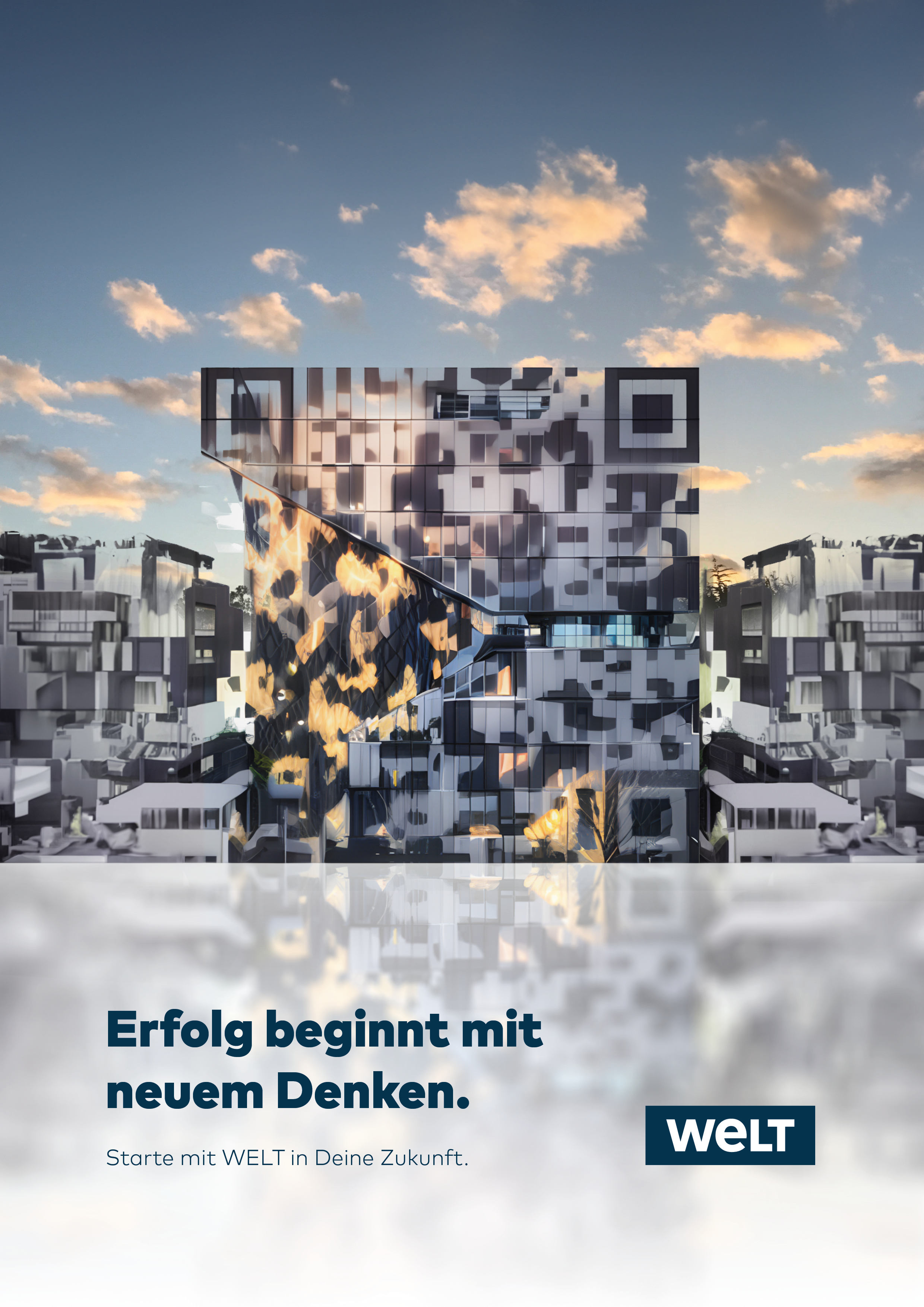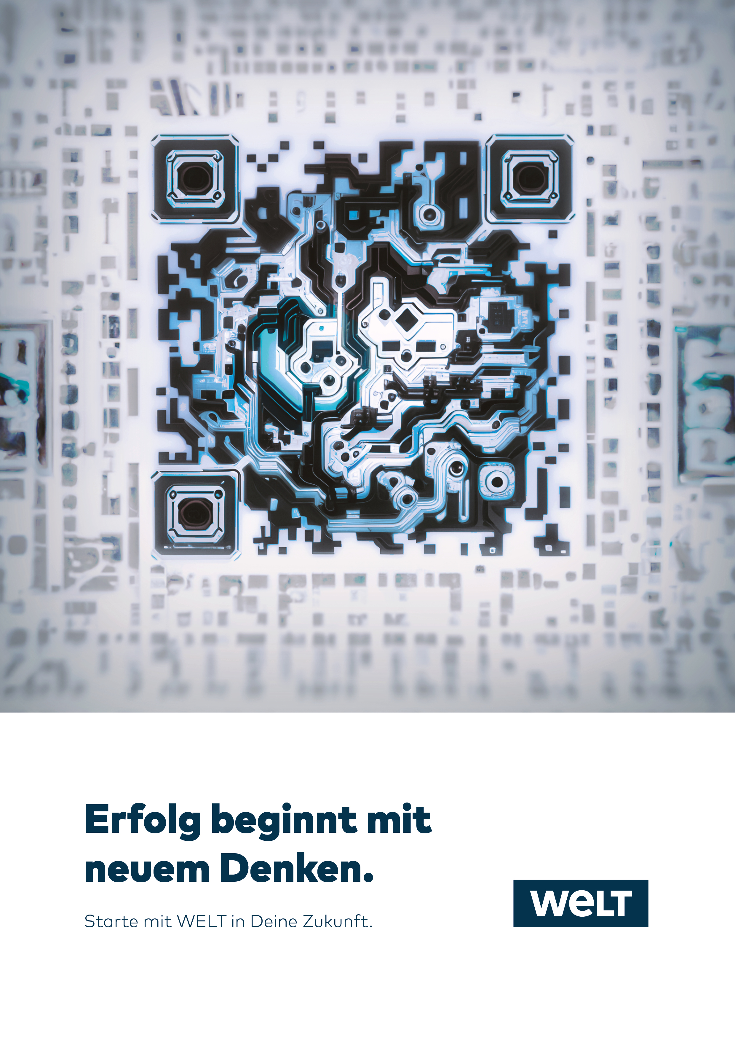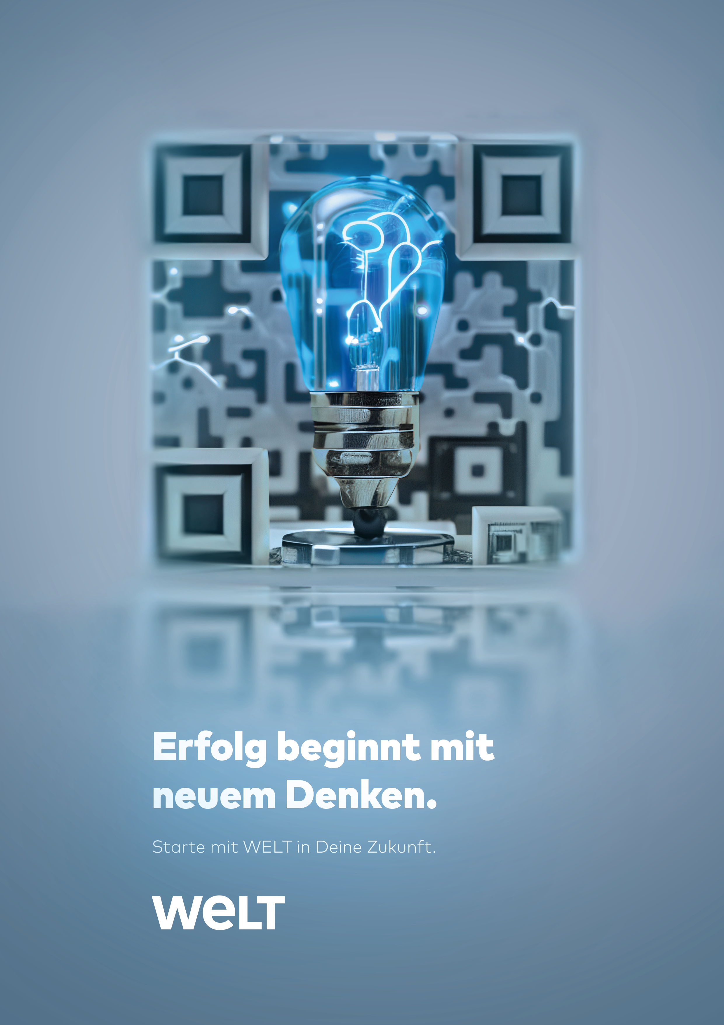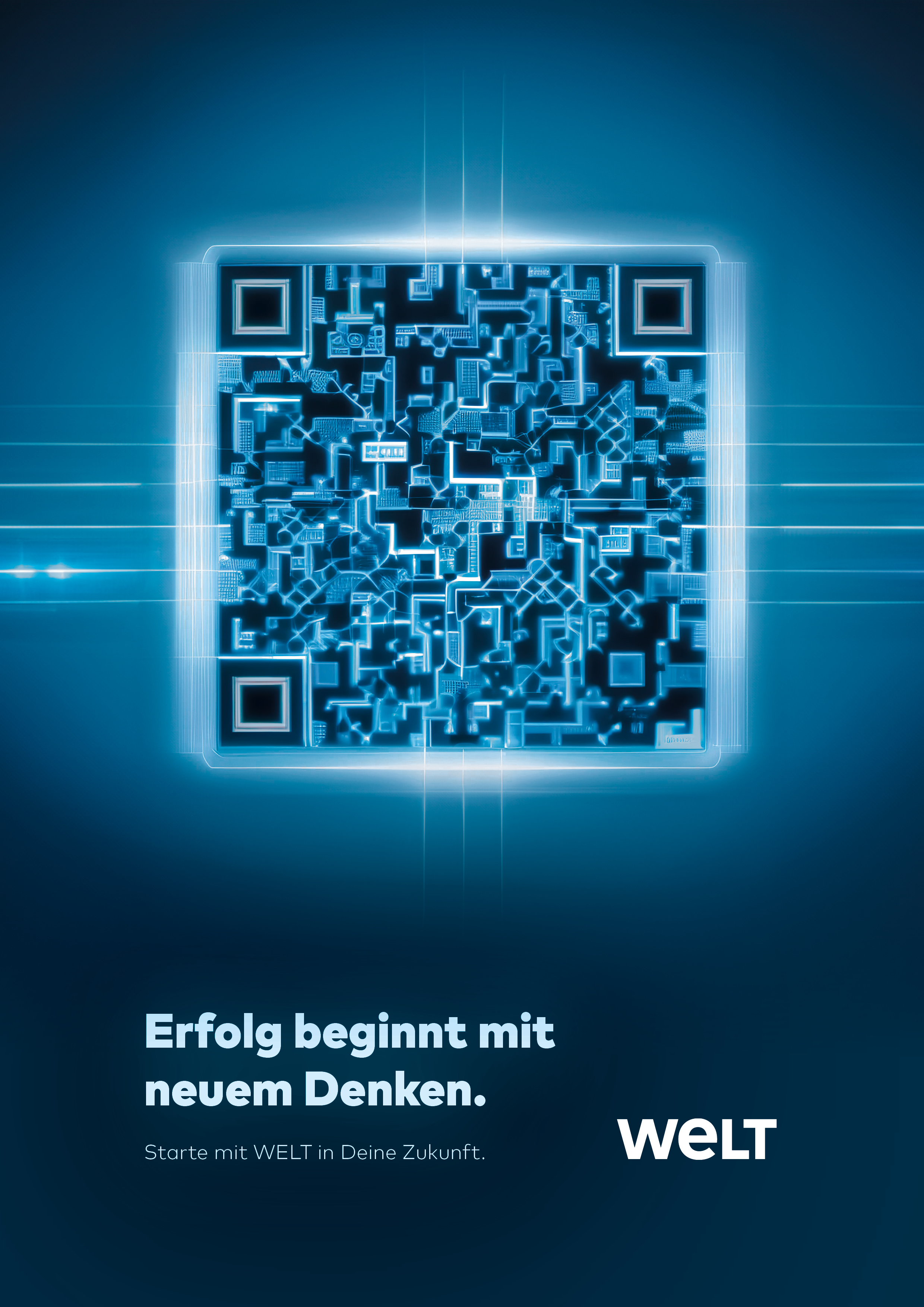 The project was designed for the business department of the German news media brand WELT, aiming to attract young employees through a magazine ad. The creative brief was to embody the claim "Erfolg beginnt mit neuem Denken" (Success begins with thinking new), integrating a QR-code.